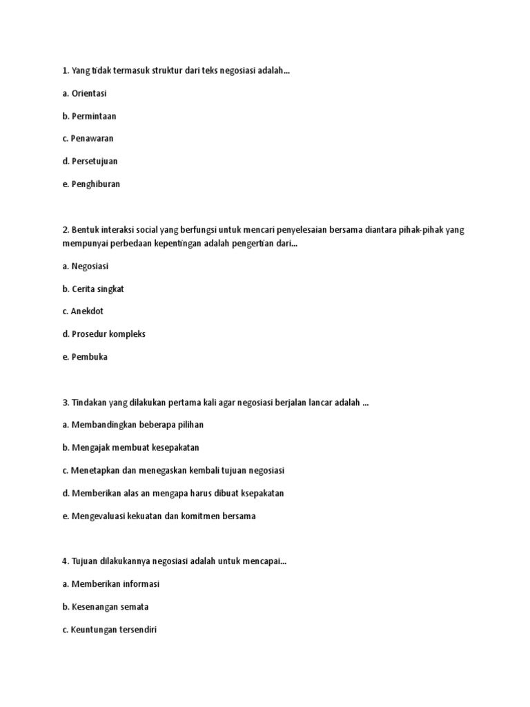 Latihan soal pilihan ganda materi teks negosiasi beserta jawaban. Cara agar negosiasi nah itulah penjelasan mengenai pengertian teks negosiasi, struktur, unsur, ciri dan contohnya, semoga apa yang dipaparkan tentang teks negosiasi dapat. Dengan melakukan negosiasi kita bisa memperoleh manfaat berupa. B soal tentang negosiasi 1. Struktur teks negosiasi antara lain: